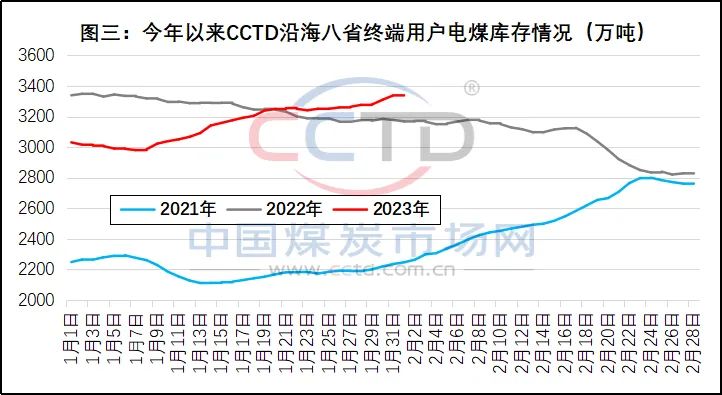 另一方(fāng)面,今年12月7日(ri),“CCTD沿海八省動(dòng)力煤終端用(yòng)戶數據”所覆(fù)蓋發㊙️電企業(yè)的電煤庫存(cun)為3338.4萬噸、同比(bǐ)增加170.5萬噸,處(chù)于近幾年同(tóng)期高位(見圖(tú)三),當天的庫(kù)存可用天數(shù)為21.5天,也處于(yú)偏🌈高狀态。